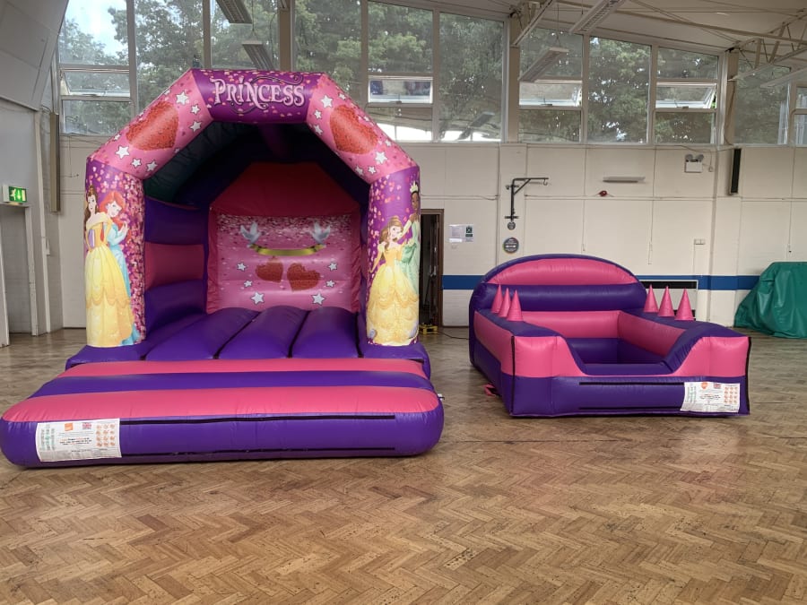 Our princess theme bouncy castle & ball pond package is the perfect set to make every princess party unforgettable. The beautiful artwork and bright purple and pink colours will catch every childs eye and the Disney princess designs throughout the castle will really make your party a royal affair. Our pink and purple ball pond is like no other and has a special air ball challenge along each side to add to the party fun.