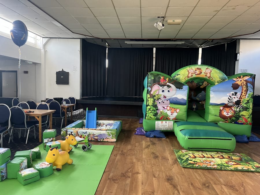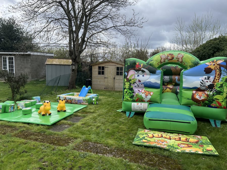 The jungle theme bouncy castle has an age limit of 8 years and the soft play has an age limit of 4 years.